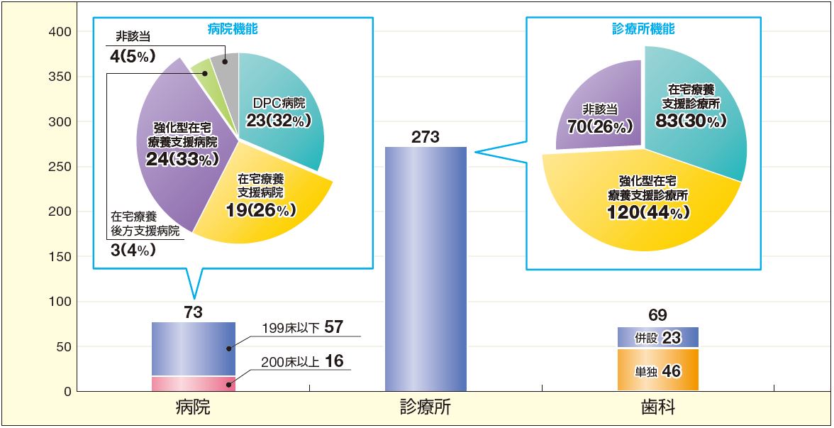 200床未満57病院のうち、43病院が在宅療養支援病院の届出を行っており、そのうち24病院は緊急往診や看取りが一定数以上ある強化型在宅療養支援病院です。医科診療所273施設のうち、203診療所(74%)が在宅療養支援診療所で、そのうち120診療所が強化型在宅療養支援診療所です(2025年3月末日現在)。
