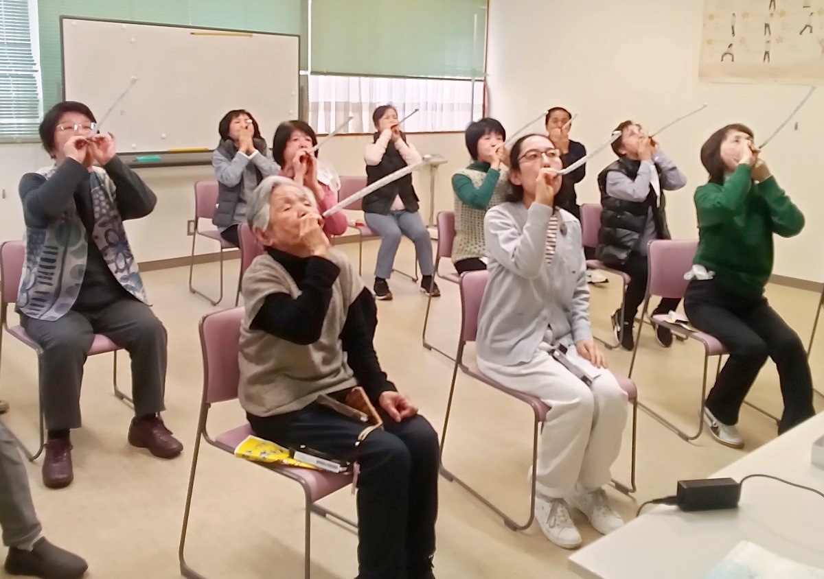 医療福祉生協は、地域のオーラルフレイル予防活動に積極的にとりくんでいます。お口の健康の大切さを学ぶ学習会をはじめ、子どもから大人まで楽しくとりくめる「あいうべ体操」や吹き戻しを使った口腔体操などが好評で、組合員・地域住民とともに実践しています。